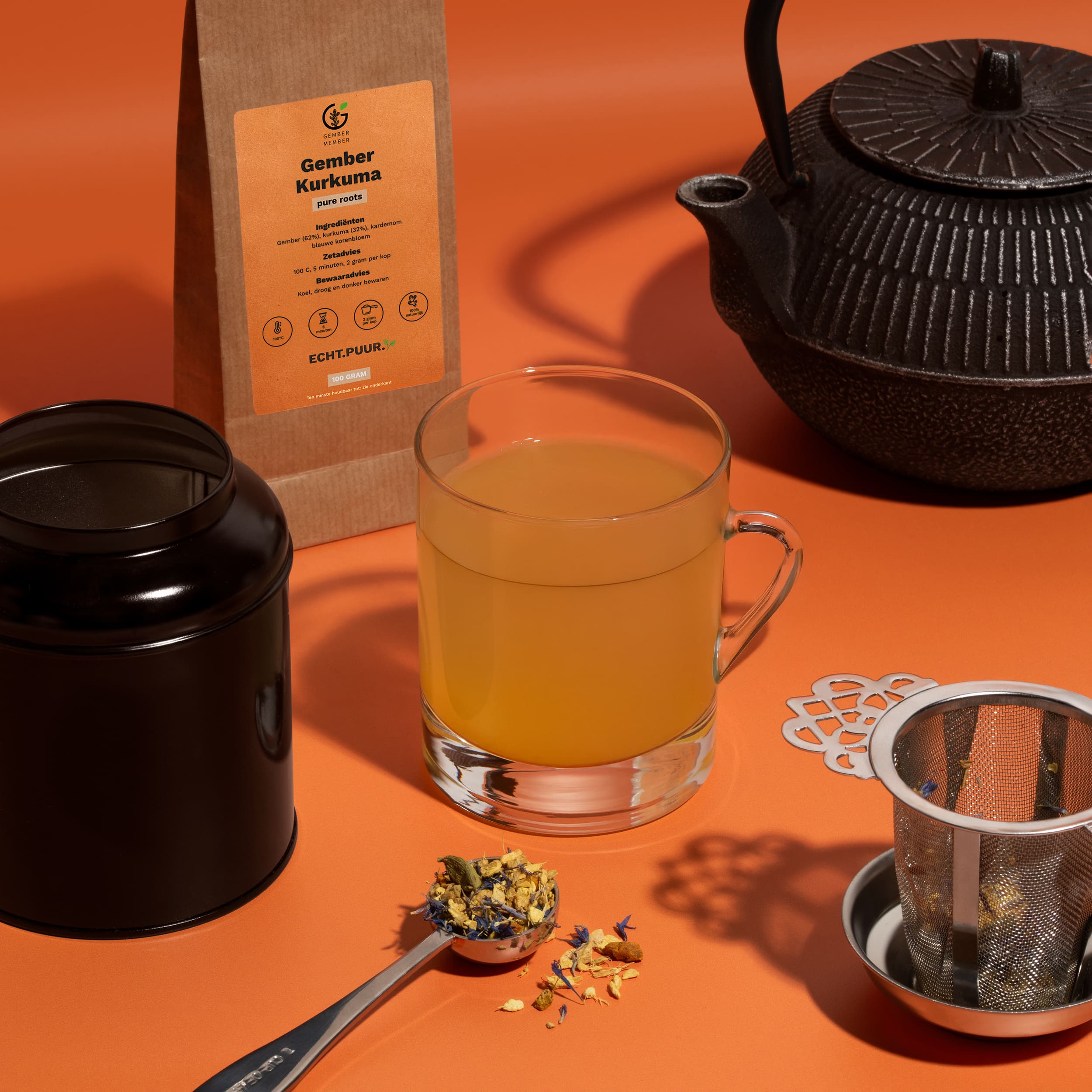 Een uitgebalanceerde blend van gember en kurkuma met subtiele kruidigheid.