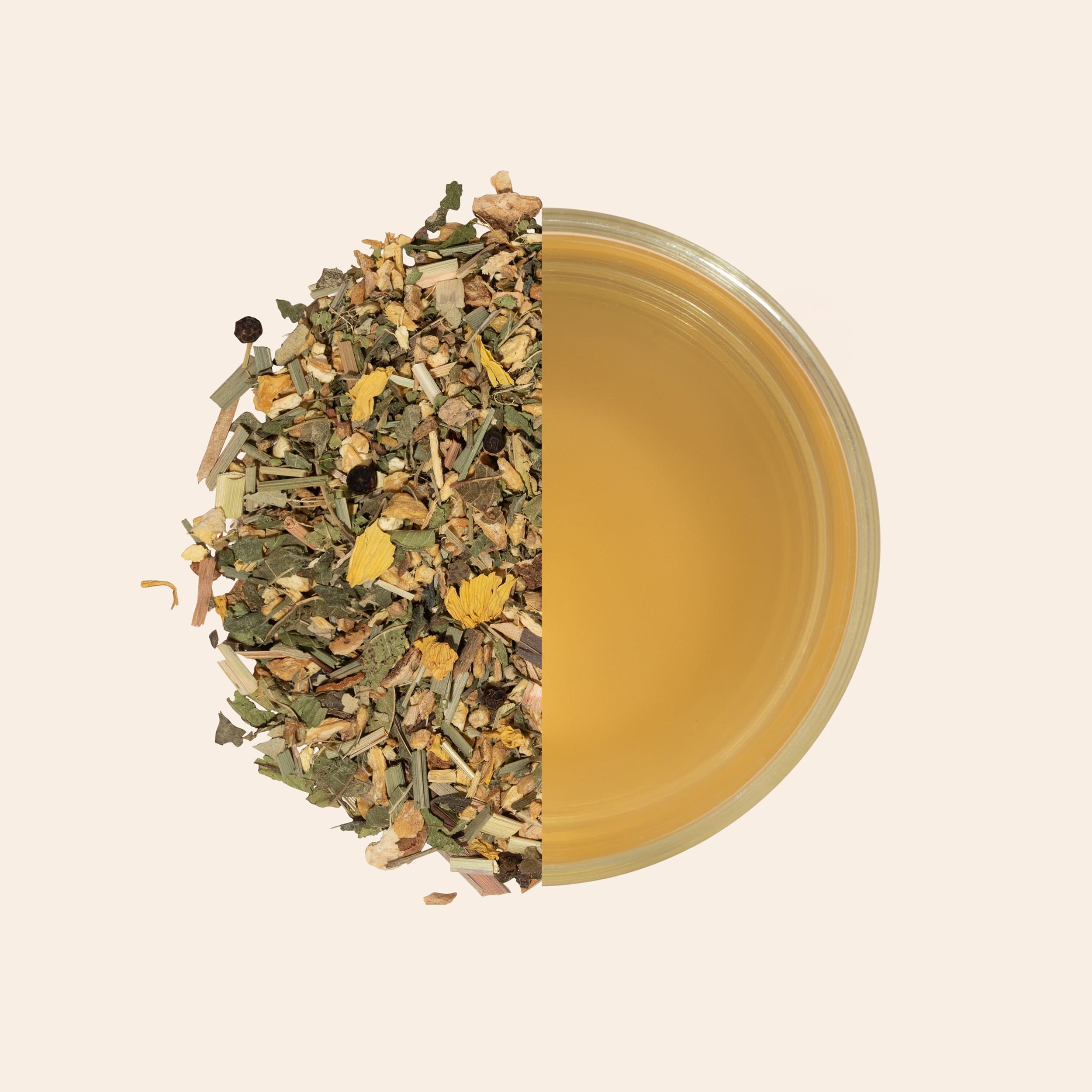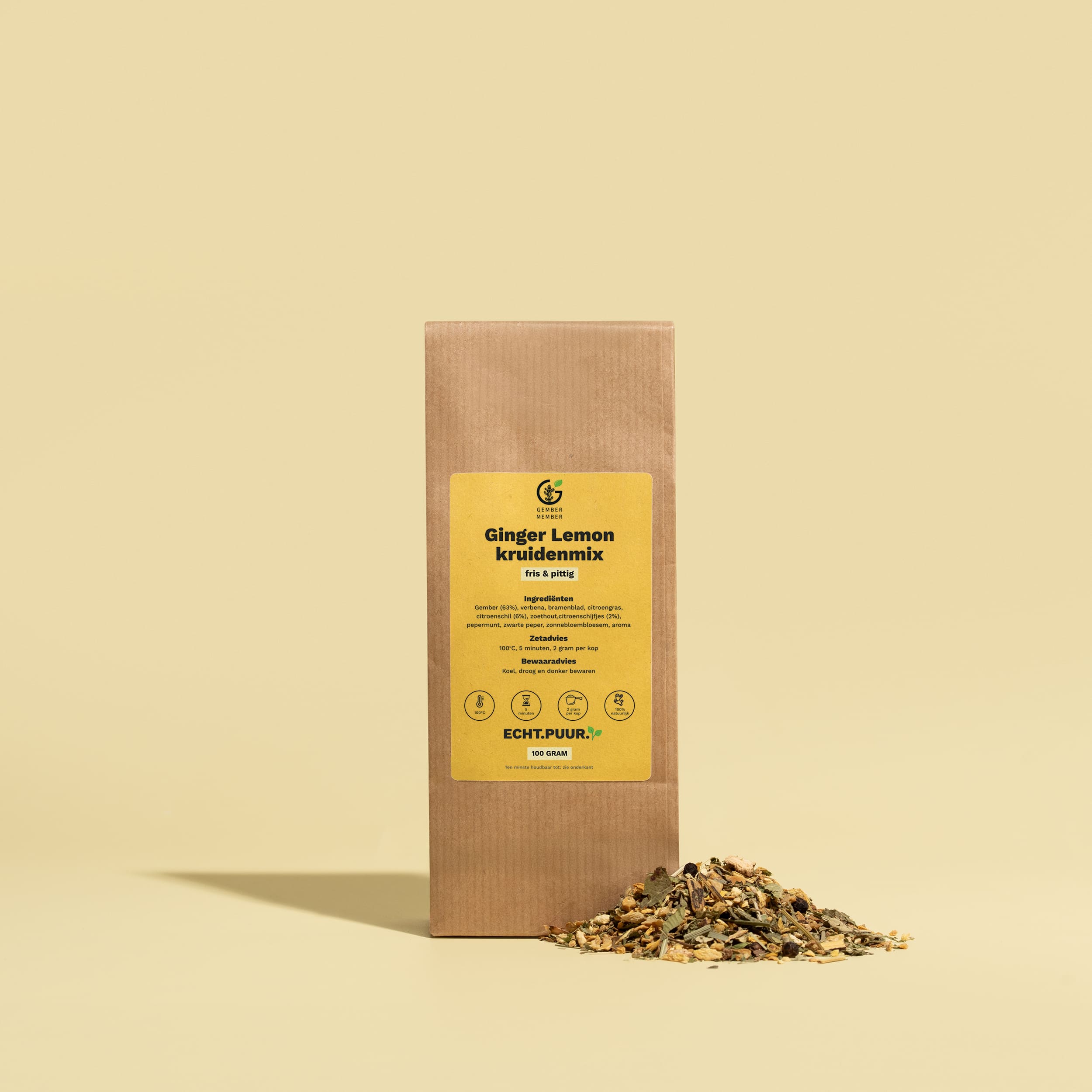 Fris in de eerste slok. Pittig in de kern. Deze Ginger Lemon kruidenmix draait om échte gemberkracht met een heldere citrus-twist. Met 63% gember als stevige basis proef je direct de intensiteit. Citroengras en citroenschil brengen frisheid, terwijl verbena, bramenblad en pepermunt zorgen voor balans. Een vleugje zwarte peper geeft diepte in de afdronk.